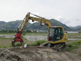 した材の集材用エクステンションアームトラック・クローラへの積み込みや、また必要があれば、作業道開設なども1台で行います。主としてトラックへの積み込みに使用します。エクステンションアームのリーチを600mm延長しているため、トラック・クローラ背後からの6m材の積み込みなどが容易です。