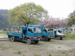 クレーン:タダノ特に4tや2WDトラックでは困難な悪路に入っての積み込み作業に力を発揮します。クレーンを使用して材を積み込み、市場までの運送をします。平ぼては6mや4m材が多い現場で使用します。